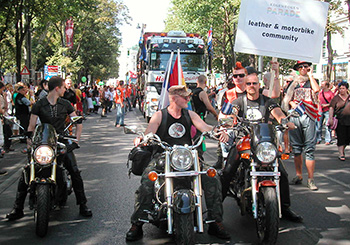 Above: My man Frank, Mr. Leather Austria 1997, at the Mr. Leather Europe contest in Manchester. Above right: The LMC Vienna biker group at the Regenbogenparade 2007. Tramway tour at Vienna Fetish Spring 2014. The poster for Wien in Schwarz (Vienna in Black) 2005. |