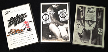 Above 1. photo: The decisive motor bike tour into Weinviertel. I'm left side with the red cap. The 1. LMC Vienna-Logo designed by myself. Invitation for the Letherball 1986, Safe Sex Poster 1989, Invitation to a Safe Sex Party. Below left: I won the contest by Vienna in Black and had became the titel of Mr. Tiberius Leather 1993. At the friendship meeting in Brussel 1994. |